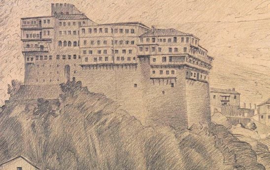 Το σχέδιο είναι το δέρμα της εικόνας. Το μάτι μεταφέρει σ’ αυτό το δέρμα (που είναι το πρωταρχικό, το πιο εκτεταμένο μας όργανο, το σχετικό με την αφή και τη γνωριμία μας με τον κόσμο και που το θυμίζουν οι πόροι του χαρτιού) ένα τοπόσημο. Το τοπόσημο στην εικόνα είναι η κάθε ξεχωριστή Μονή του Αγίου Ορους, που στα έργα αυτά μας αποκαλύπτει ως «σκευή» το ένδυμα μιας σύνθετης ψυχοπνευματικής συγκίνησης.