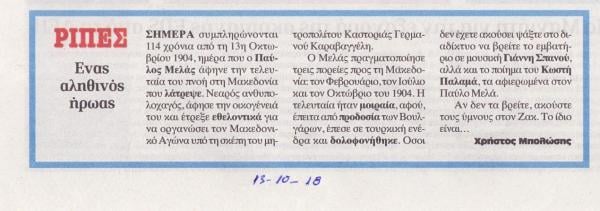 Προχθές, 13 Οκτωβρίου, ήταν η επέτειος των 114 ετών από του μαρτυρικού θανάτου του Παύλου Μελά, έγραψα στην «δημοκρατία» την παρακάτω «Ριπή», ως ελαχιστότατο φόρο τιμής στον ήρωα του Μακεδονικού Αγώνα: