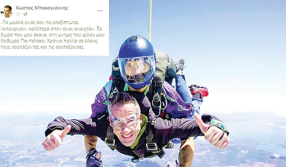 Ο Κώστας Μπακογιάννης άναψε κερί για τον φίλο του, που του λείπει, στο ψηφιακό παρεκκλήσι του Μάρκου του Ζούκερμπεργκ του Λογοκριτή και, αντί για χαρτάκι «υπέρ αναπαύσεως», άφησε στο διαδικτυακό παγκάρι μια φωτογραφία του, στην οποία δείχνει πανευτυχής την ώρα που κάνει πτώση με αλεξίπτωτο και κάποιος άλλος (προφανώς ο εκπαιδευτής του) βρίσκεται καβαλημένος στην πλάτη του.