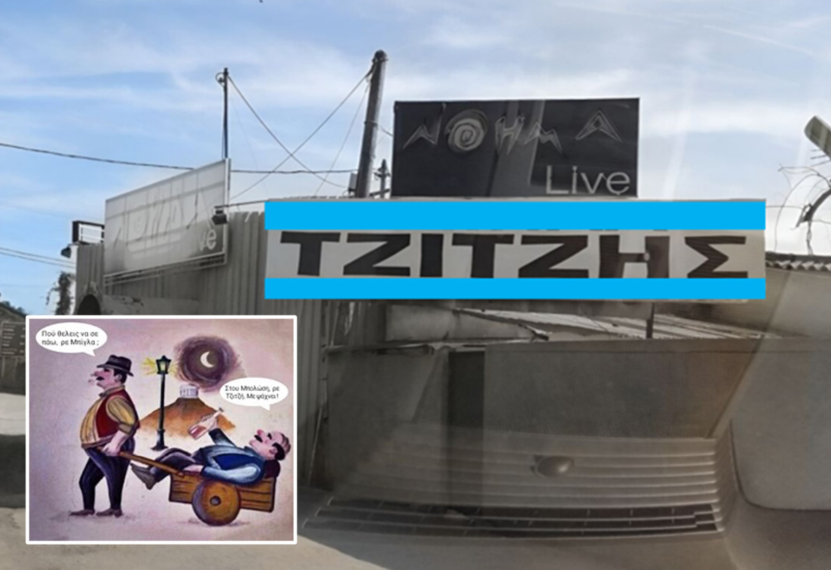 Μέσα σ’ όλα αυτά ο πιστός φίλος της στήλης Αργύρης Λ., θέλοντας να αποκαταστήσει την καταρρακωθείσα υπόληψή μου, ερεύνησε και βρήκε. Τι βρήκε; Αυτούς που σας έχω παρουσιάσει εδώ και 2-3 χρόνια. Τον Τζίτζη και τον Μπίχλα, όπου Τζίτζης, ο μυστηριώδης τύπος που ενεφανίσθη στον συνοικιακό καφενέ από το πουθενά και αναλύει τα γεγονότα στους πιστούς θαμώνες του καφενείου, του οποίου ιδιοκτήτης είναι ο Νικόλαος Μερακλής, ο επιλεγόμενος και Μπίχλας, καθόσον η καθαριότητα δεν είναι και το δυνατό του σημείο.