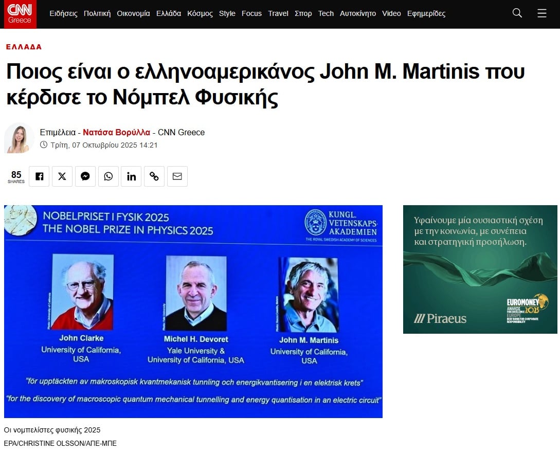 Πρόσφατα γίναμε ακόμα μία φορά ρεζίλι, πανηγυρίζοντας για το Νόμπελ Φυσικής του Κροάτη Τζον Μαρτίνις, ο οποίος το μοιράστηκε μαζί με δύο ακόμα επιστήμονες. Το επίθετο «Μαρτίνις» ήχησε ελληνικό σε αρκετούς δημοσιογράφους, και έτσι προέκυψε το παραμυθάκι της ελληνικότητάς του. Πολλά ΜΜΕ την πάτησαν (βλ. εικόνες).