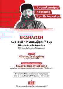 Εκδήλωση αποκαλυπτηρίων της προτομής του Άρη Βελουχιώτη, την Κυριακή 19 Οκτώβρη, στις 6 μ.μ. στην ομώνυμη Πλατεία (Έλλης και Βαλτετσίου) της Πετρούπολης.