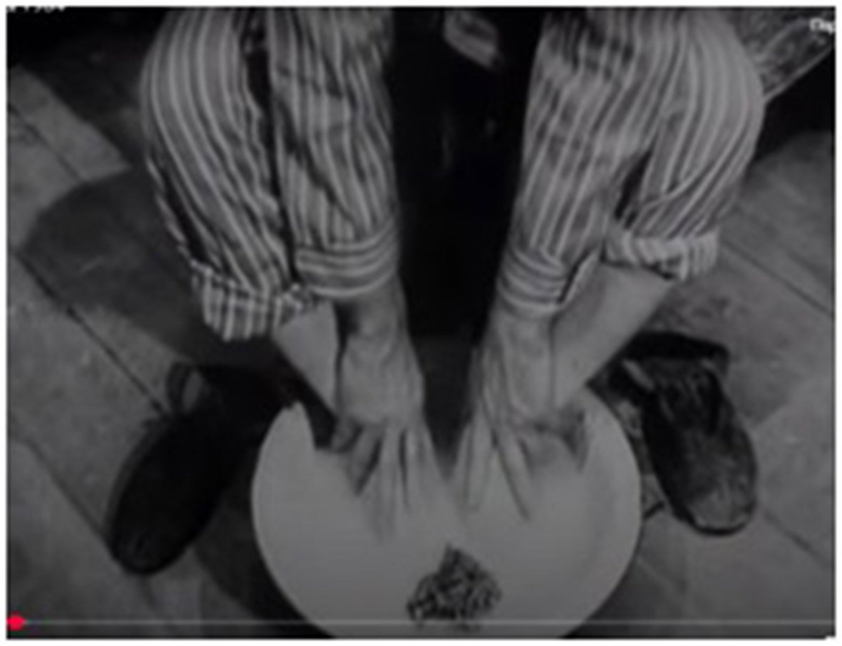 Στην ταινία «Γκολ στον έρωτα» του 1954, ο μπαρμπέρης Παντελής (Μίμης Φωτόπουλος) επιστρέφει ποδαρόδρομο από τον ιππόδρομο, όπου τον παρέσυρε εκεί ο Πίπης ψιλικατζής και φανατικός… «αλογομούρης». Φθάνοντας σπίτι κάνει ποδόλουτρο σε μια λεκάνη. Δίπλα ακριβώς διακρίνονται οι δύο παντόφλες του οι οποίες είναι πατημένες στη φτέρνα.