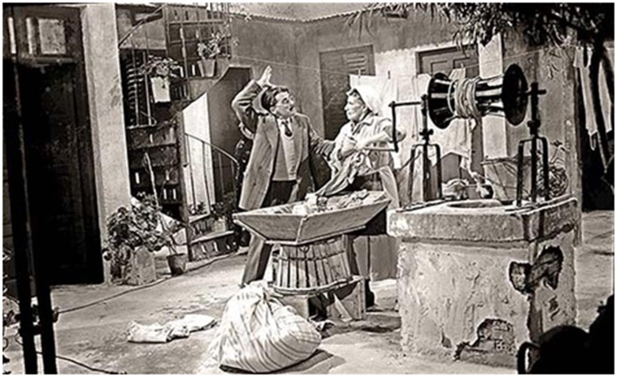 Η αυλή της κυρά Καλλιόπης (Γεωργία Βασιλειάδου) της «Καφετζούς» και το καφετζή του Σπύρου (Μίμης Φωτόπουλος), όπως ήταν το 1955 στα Πετράλωνα, όταν ο Αλέκος Σακελλάριος, γύρισε την ταινία