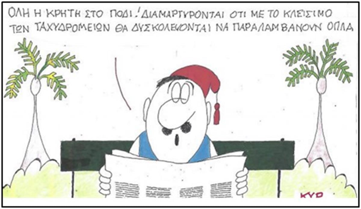 - Το τραγούδι «Ο Ταχυδρόμος Πέθανε», γράφτηκε από τον Μάνο Χατζηδάκι, (το τραγούδησε η Ζωή Φυτούση) για την παράσταση «Απόψε αυτοσχεδιάζουμε» του Λουίτζι Πιραντέλλο. Το έργο ανέβηκε σε μετάφραση και σκηνοθεσία Δημήτρη Μυράτ τον Οκτώβριο του 1961, στο θέατρο “Αθηνών”. Χρειάστηκε να περάσουν 64 χρόνια από τότε για να επέμβει ο αντιπρόεδρος της κυβερνήσεως κ. Κ. Χατζηδάκης και να διαψεύσει τον μεγάλο συνθέτη, αφού ο ταχυδρόμος ζωντάνεψε. Και ζωντάνεψε, επειδή αντιστοίχως πέθαναν τα ΕΛΤΑ, ίνα πληρωθεί το ρηθέν υπό των προφητών «Η ζωή κύκλους κάνει» ή όπως λέει ο Ζαμπέτας «Έχει η ζωή γυρίσματα». Λουκέτο λοιπόν σε 204 καταστήματα των ΕΛΤΑ ανά την Ελλάδα, διότι το σπείρανε μπαρούτι το μαγαζί, οι εκλεκτοί των εκάστοτε κυβερνήσεων, χωρίς, εννοείται, κάποιος να λογοδοτήσει. Έτσι να ετοιμαστούμε να ξαναδούμε τον γραφικό ταχυδρόμο με το ποδήλατο, την τεράστια τσάντα και την καραμούζα να επισκέπτεται τα χωριά Δευτέρα, Τετάρτη, Παρασκευή και να μοιράζει συντάξεις και λογαριασμούς. Λυσσάξατε πιά. Τι ωραία που ήταν παλιά και τι ωραία χρόνια! Λουστείτε τα τώρα. Ελλάδα 2.0 γαρ. Αναρωτιόταν ο Χατζηδάκις: «Ποιος θα σου φέρει αγάπη μου, το γράμμα που ‘χα τάξει» Ο ταχυδρόμος αγάπη μου, ο ταχυδρόμος. Ο Λαυρέντης Διανέλλος στην «Ψεύτρα». Και οι τοπικοί βουλευτές της ΝΔ, πώς αντέδρασαν; ΝΑΙ σε όλα.