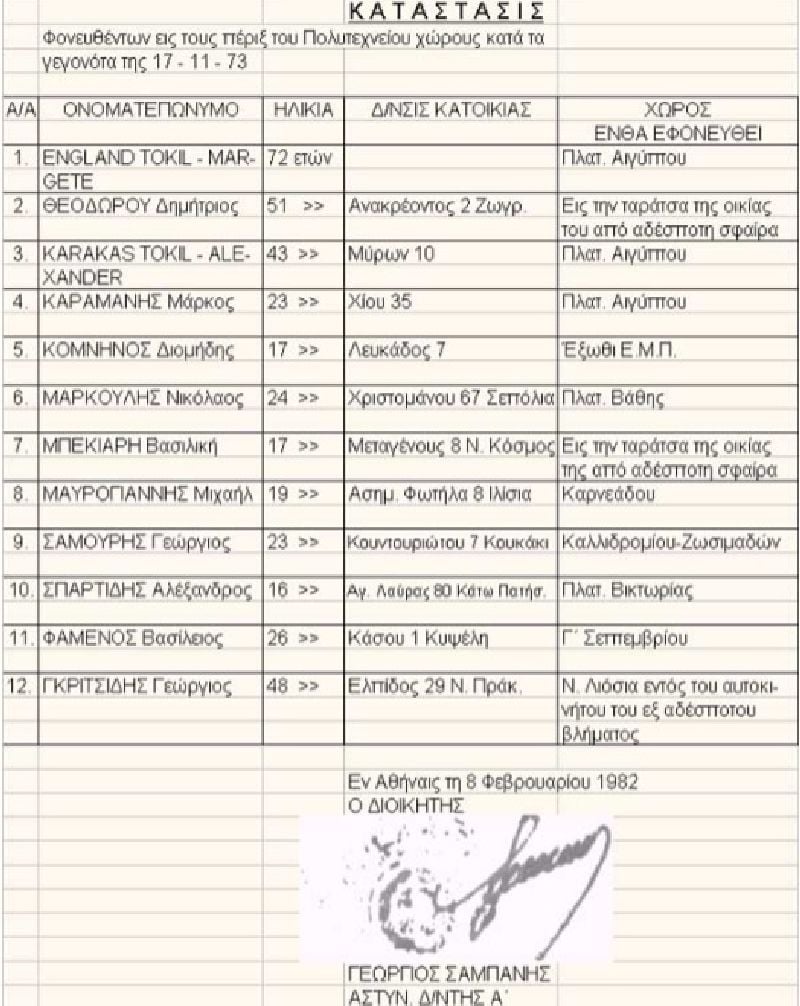 12. Στυλιανός Αγαμ. Καραγεώργης, ετών 19, εργάτης. Ετραυματίσθη θανασίμως επί της οδού Πατησίων, έμπροσθεν του κινηματογράφου ΕΛΛΗΝΙΣ, περί ώρα 10.00 της 17.11.1973, βληθείς εκ διερχομένου άρματος και απεβίωσεν εις το ΚΑΤ την 30.11.1973.