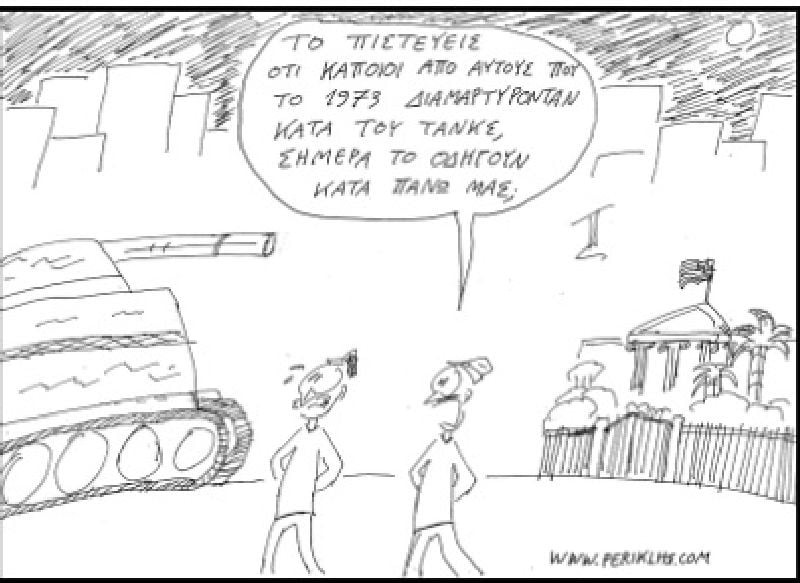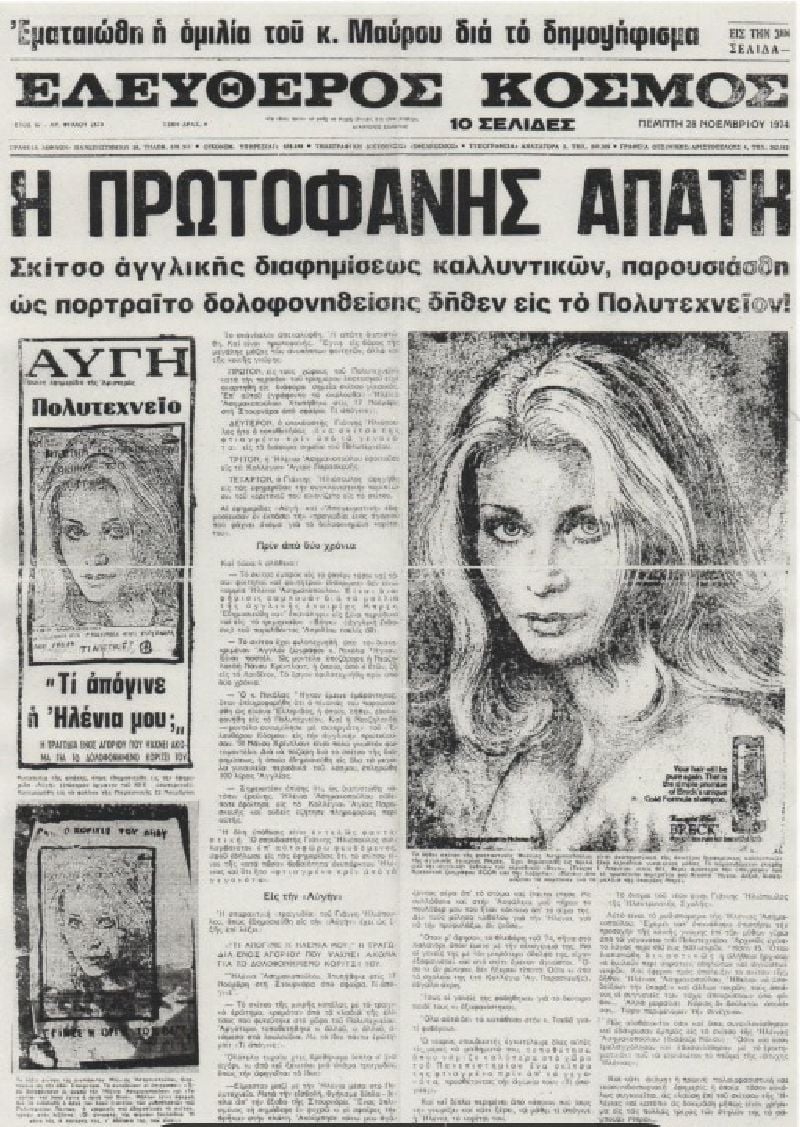 Και για να θυμηθούμε την ιστορία, διαβάστε το πρωτοσέλιδο του «Ελευθέρου Κόσμου» και μία κακεντρεχή χιουμοριστική σύνθεση, που αναφέρεται στην εκφωνήτρια του πολυτεχνείου Μαρία Δαμανάκη.