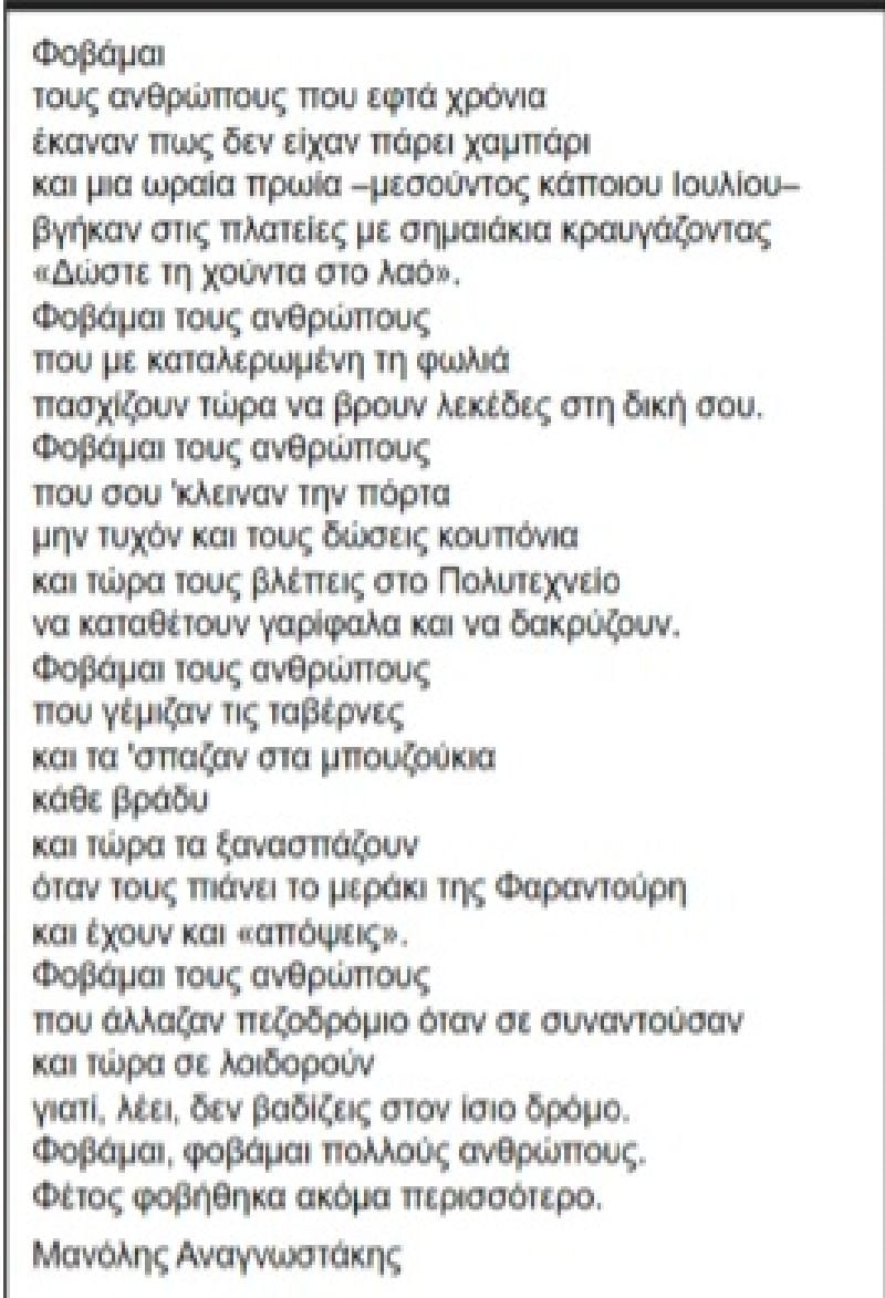 • Ο Μανώλης Αναγνωστάκης, γνωστός ποιητής τα Αριστεράς έγραψε το παρακάτω δολοφονικό ποίημα: