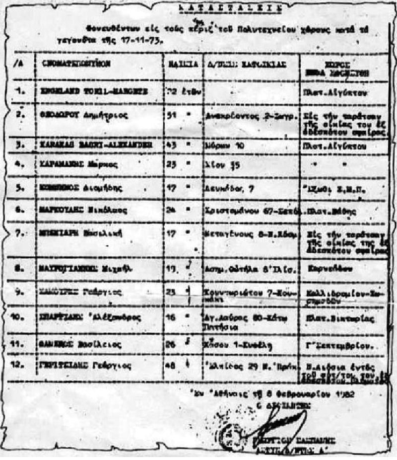 1. Διομήδης Ιωάννου Κομνηνός, ετών 17, μαθητής. Εφονεύθη έξωθι του Πολυτεχνείου περί ώρα 22:15 της 16.11.73. Βασίμως πιθανολογείται ότι δράστης του φόνου τούτου είναι ο προεκτεθείς Συνταγματάρχης.
