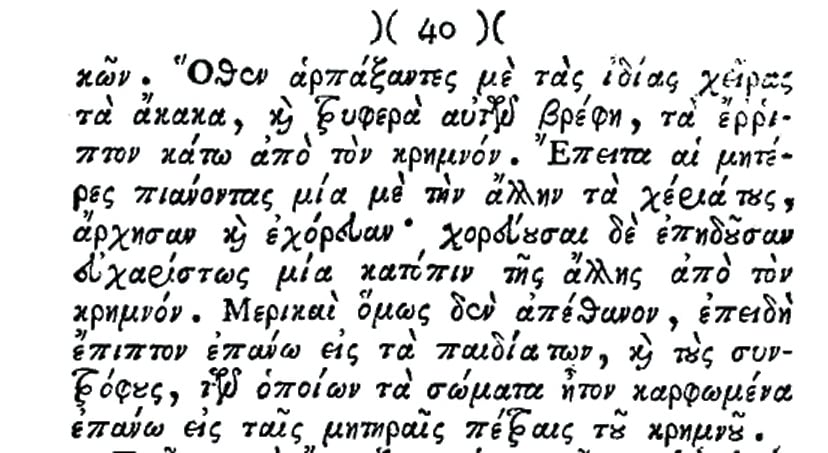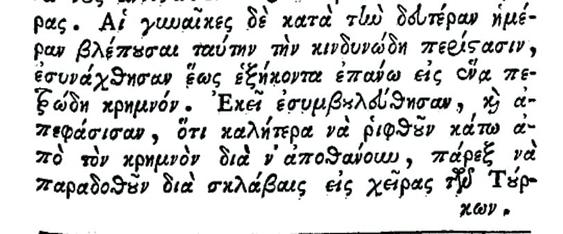 «Αι γυναίκες δε κατά την δευτέραν ημέραν βλέπουσαι ταύτην τη κινδυνώδη περίστασιν, εσυνάχθησαν έως εξήκοντα, επάνω εις έναν πετρώδη κρημνόν. Εκεί εσυμβουλεύθησαν και απεφάσισαν ότι καλήτερα να ριφθούν κάτω από τον κρημνόν διά να αποθάνουν, πάρεξ να παραδοθούν διά σκλάβες εις χείρας των Τούρκων. Όθεν αρπάξαντες με τας ιδίας των χείρας τα άκακα και τρυφερά βρέφη, τα έρριπτον κάτω από τον κρημνόν. Έπειτα αι μητέρες πιάνοντας η μία με την άλλην τα χέρια τους, άρχισαν και εχόρευαν∙ χορεύουσαι δε επηδούσαν ευχαρίστως μία κατόπιν της άλλης από τον κρημνόν. Μερικαί όμως δεν απέθανον, επειδή έπιπτον επάνω εις τα παιδία των και τους συντρόφους, των οποίων τα σώματα ήταν καρφωμένα πάνω εις τες μητηραίς πέτρες του κρημνού».
