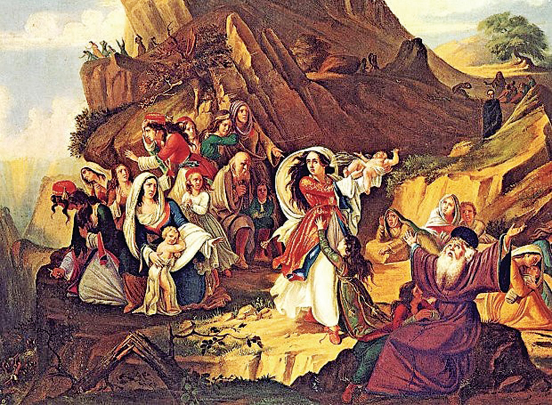 «Αι γυναίκες δε κατά την δευτέραν ημέραν βλέπουσαι ταύτην τη κινδυνώδη περίστασιν, εσυνάχθησαν έως εξήκοντα, επάνω εις έναν πετρώδη κρημνόν. Εκεί εσυμβουλεύθησαν και απεφάσισαν ότι καλήτερα να ριφθούν κάτω από τον κρημνόν διά να αποθάνουν, πάρεξ να παραδοθούν διά σκλάβες εις χείρας των Τούρκων. Όθεν αρπάξαντες με τας ιδίας των χείρας τα άκακα και τρυφερά βρέφη, τα έρριπτον κάτω από τον κρημνόν. Έπειτα αι μητέρες πιάνοντας η μία με την άλλην τα χέρια τους, άρχισαν και εχόρευαν∙ χορεύουσαι δε επηδούσαν ευχαρίστως μία κατόπιν της άλλης από τον κρημνόν. Μερικαί όμως δεν απέθανον, επειδή έπιπτον επάνω εις τα παιδία των και τους συντρόφους, των οποίων τα σώματα ήταν καρφωμένα πάνω εις τες μητηραίς πέτρες του κρημνού».