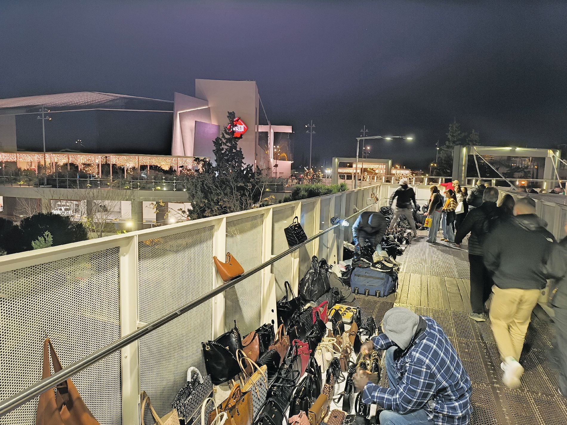 Οι φωτογραφίες της στήλης με τους Αφρικανούς να πουλάνε προϊόντα «μαϊμού» ελήφθησαν προπαραμονή Χριστουγέννων, έξω από το εμπορικό κέντρο (το λεγόμενο «mall»), που βρίσκεται στη στάση Νερατζιώτισσα, κοντά στο Μαρούσι. Εκεί γίνεται κανονικό όργιο παραεμπορίου υπό τα απαθή όμματα της ΕΛ.ΑΣ. Αστυνομικοί με μοτοσικλέτες (Ομάδα ΔΙΑΣ) βρίσκονταν στην είσοδο του mall, σε απόσταση περίπου 30 μέτρων. Οταν τους ρώτησα γιατί δεν κάνουν κάτι, απάντησαν: «Αυτό γίνεται εδώ και δέκα χρόνια. Τους διώχνουμε και ξανάρχονται. Κι όταν τους πιάνουμε, ο υπεύθυνος του mall δεν έρχεται να καταθέσει».