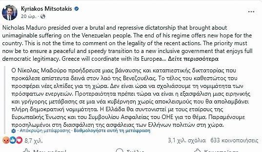 Λίγη ώρα αργότερα ο πρωθυπουργός της χώρας μας επικρότησε ανοικτά, ο μόνος στην Ευρώπη, την ενέργεια του προέδρου Τραμπ και στην ανάρτησή του στο Χ, χωρίς την παραμικρή αναφορά στο Διεθνές Δίκαιο, σημείωνε ότι «δεν είναι ώρα να κριθεί η νομιμότητα των ενεργειών του Αμερικανού προέδρου»!