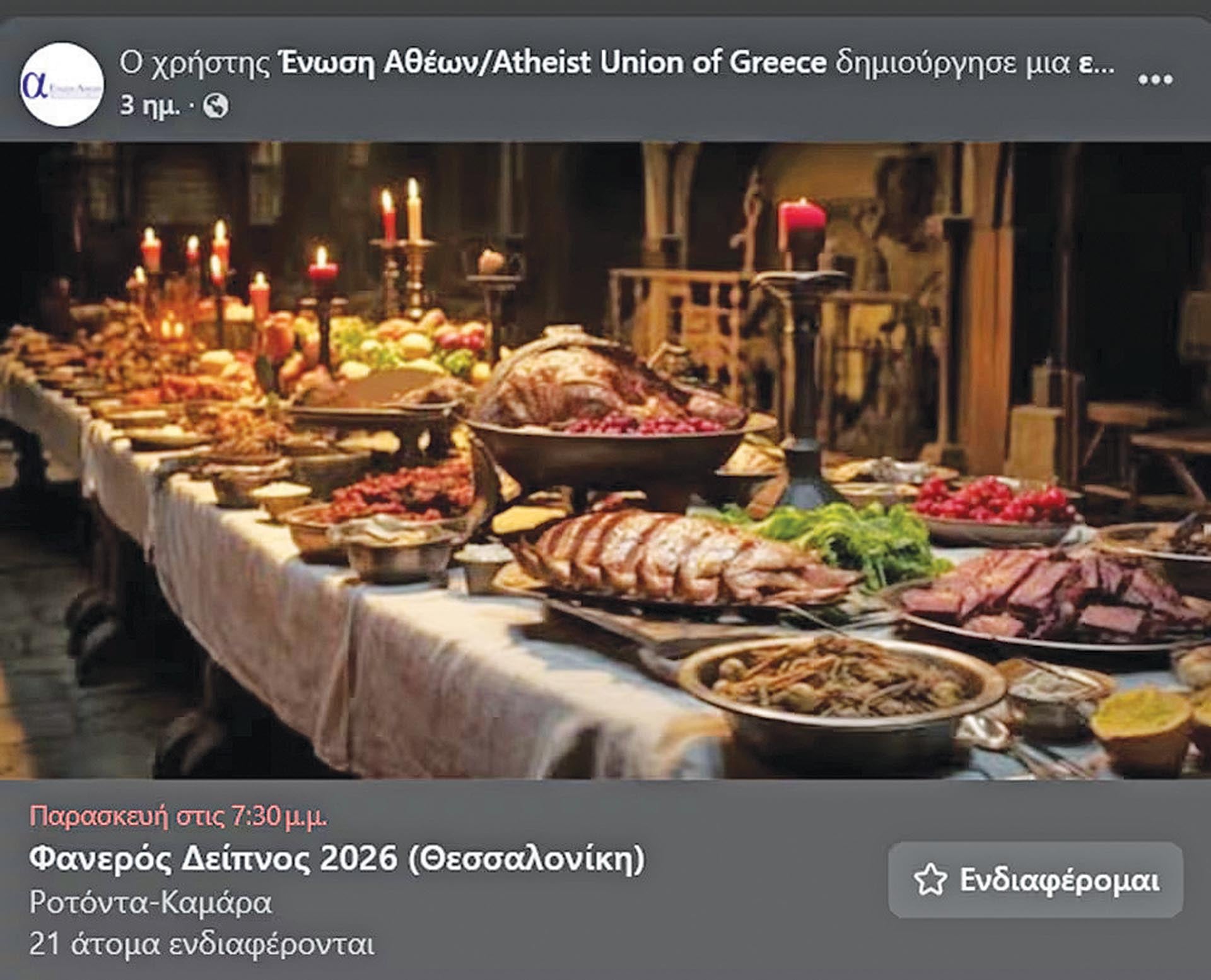 Υπό αυτήν την έννοια το γεγονός ότι η Ενωση Αθέων μάς ενημέρωσε με δημόσια ανακοίνωσή της ότι θα διοργανώσει «φανερό δείπνο» κατ’ αντιδιαστολή του Μυστικού Δείπνου τη Μεγάλη Πέμπτη και τη Μεγάλη Παρασκευή σε τέσσερις πόλεις της Ελλάδος (την Αθήνα, τη Θεσσαλονίκη, τις Σέρρες και τον Βόλο) δεν αποτελεί για μας θέμα, καταρχάς. Αν τα μέλη της δεν πιστεύουν, δικαίωμά τους, εδώ υπάρχουν χριστιανοί που δεν νηστεύουν, ποιος θα κρίνει τους ανθρώπους για αυτή τους την ελεύθερη επιλογή; Ούτε αποτελεί για μας θέμα το γεγονός ότι η ένωση καλεί τα μέλη της σε συγκεκριμένες ταβέρνες, τσιπουράδικα και μεζεδοπωλεία για να καταναλώσουν κρέας. Διαφωνούμε, αλλά δικαίωμά τους.