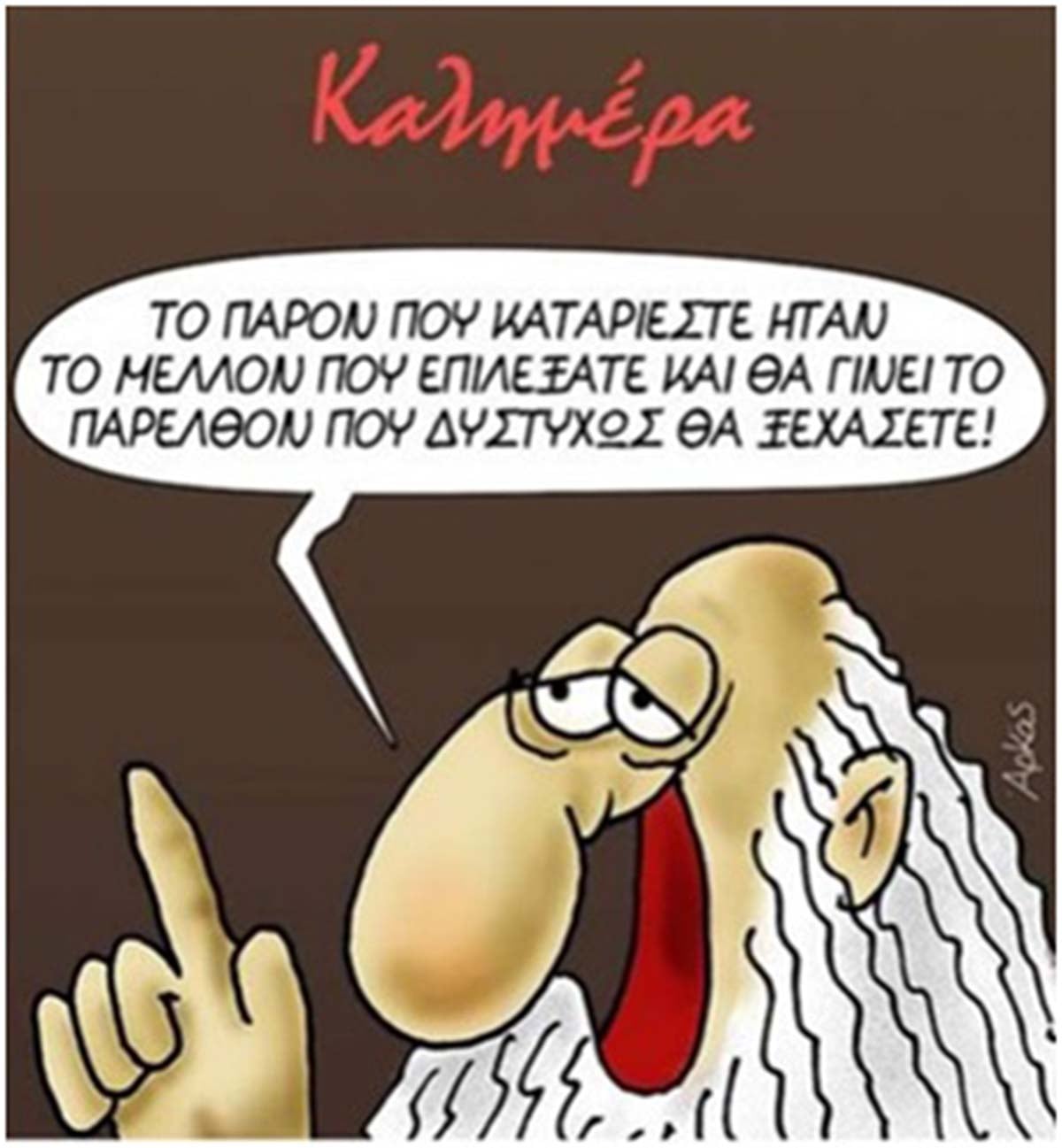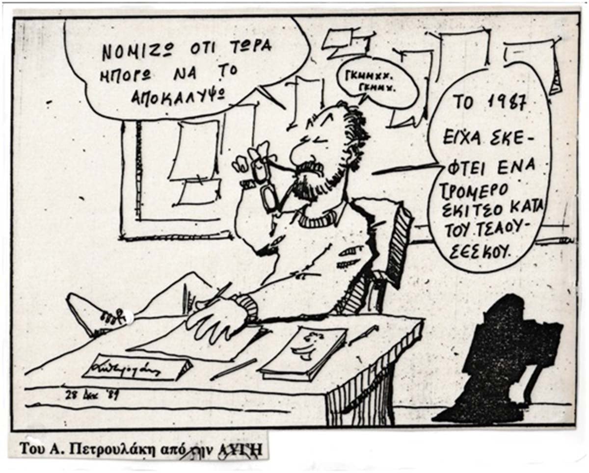 Και κλείνω με μία γελοιογραφία – έπος του κ. Α. Πετρουλάκη που δημοσιεύθηκε στις 28 Δεκ. 1989 στην «Αυγή».