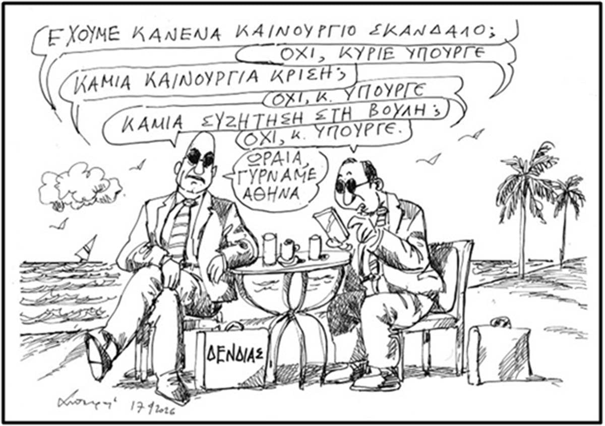 - α. Δηλαδή από έναν πρωθυπουργό, δεκάδες βουλευτές και υπουργούς, εκατοντάδες αρμοδίους και μη που τα ονόματά τους ακούστηκαν για τα «Τέμπη», τις υποκλοπές και τον ΟΠΕΚΕΠΕ, μόνο ο κ. Μυλωνάκης (Ολόθερμες ευχές για περαστικά) άντε και λίγο (με… σπρώξιμο – έτσι τη λένε τώρα την πρόγκα – της κας Ντόρας) ο κ. Λαζαρίδης εθίγησαν; Δεν τα λες και τρελά ποσοστά. Πάντως για τον κ. Λαζαρίδη βρέθηκε ο υπαίτιος. Ήταν κάποιος εισηγητής δ΄, που δεν έλεγξε καλώς τα δικαιολογητικά που υπέβαλε. Κάτι σαν σταθμάρχης δηλαδή. β. Δήλωσε η μητέρα ενός από τους φερόμενους ως εμπλεκομένους στην υπόθεση της (νέας) Μυρτούς: «…Τα παιδιά δεν έχουν κάνει έγκλημα ποτέ…». Πάντα υπάρχει η πρώτη φορά κυρία μου. γ. Πρώην μεγαλόσχημος και νυν (μάλλον) γραφικός σε τηλεοπτική συνέντευξή του είπε: «Εγώ ποτέ δεν ήμουν μόνος στη ζωή μου. Κι πριν την επταετία και μετά». Εν τάξει ρε παιδιά είπαμε. Όλοι μας υπήρξαμε αντιστασιακοί (προσωπικώς θυμάμαι κάπου στα μέσα του 1969, μέσα στο μπάνιο είχα σχολιάσει: Γιατί ρε Παπαδόπουλε;. Ήθελε μεγάλο ηρωισμό τότε να πες ρε» τον Παπαδόπουλο. Τέλος πάντων), αλλά δεν πάει παντού αυτό. Είναι σαν το αλάτι. Το πολύ βλάφτει. δ. «Οπλοστάσιο των Ρομά στο Αίγιο ανακάλυψε η ΕΛΑΣ» («δημοκρατία»). Περισσότερη ασφάλεια, αλλά και ασυδοσία, πεθαίνεις.