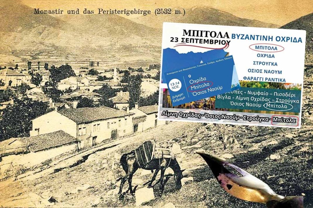 ➜ Στο κολάζ που σχηματίζουν οι σύγχρονες διαφημίσεις εμφανίζονται οι προορισμοί πολυήμερων εκδρομών που διοργανώνονται από εγχώρια τουριστικά γραφεία. Μπορεί οι ταξιδιώτες να ενημερωθούν για το παρελθόν της πόλης από τους ξεναγούς τους στη διάρκεια της εκδρομής, αλλά όλοι ξέρουμε ότι οι περισσότεροι θα αφηγούνται πως πήγαν στην Μπίτολα και όχι στο Μοναστήρι.
