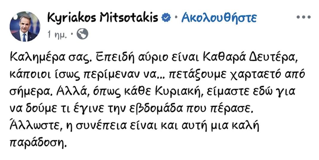 ➜ Ο πρωθυπουργός έχει αναμφισβήτητο ταλέντο στον χειρισμό της λεπτής ειρωνείας και του σαρκασμού, το οποίο ξεδιπλώνει τακτικά στα κοινωνικά δίκτυα. Υπήρξε αρκετά δημοφιλής γι’ αυτό στο ξεκίνημα της πρώτης θητείας του, όταν υποτίθεται συνέτριβε τις συριζαϊκές δυνάμεις του κακού, αλλά πλέον το πιο πιθανό είναι να… πετάει ένα μπούμερανγκ κάθε φορά που εκφράζεται έτσι!