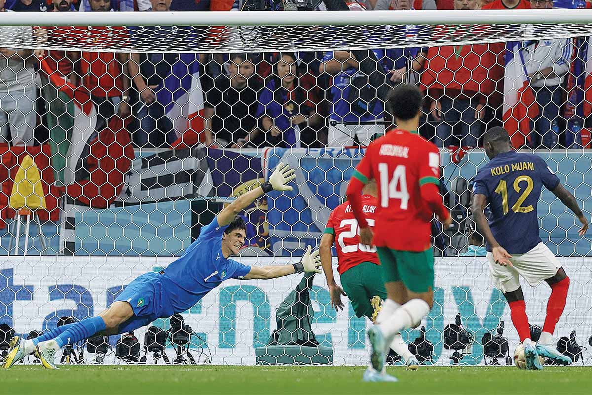 Στο δεύτερο ημίχρονο το Μαρόκο μπήκε πολύ δυνατά. Αύξησε την πίεσή του, με την άμυνα της Γαλλίας να δυσκολεύεται. Οι Βορειοαφρικανοί έκαναν κατάθεση ψυχής στο χορτάρι απέναντι στους παγκόσμιους πρωταθλητές για να φτάσουν στην ισοφάριση. Ομως η Γαλλία, που δεν έχει χάσει ποτέ ματς Μουντιάλ στο οποίο είχε το προβάδισμα στο φινάλε του πρώτου μέρους, με απολογισμό 25 νίκες και 1 ισοπαλία, ανέβασε ταχύτητα και στο 79′ ουσιαστικά… καθάρισε το ματς. Ο Εμπαπέ ελίχθηκε ωραία μέσα στην περιοχή, χόρεψε την άμυνα του Μαρόκου, έκανε το σουτ έχοντας πέντε παίκτες να τον περικυκλώνουν, με τον Μουανί να ακολουθεί την πορεία της μπάλας και με κοντινό πλασέ, στην πρώτη επαφή του με την μπάλα να νικάει τον Μπόνο για το 2-0.