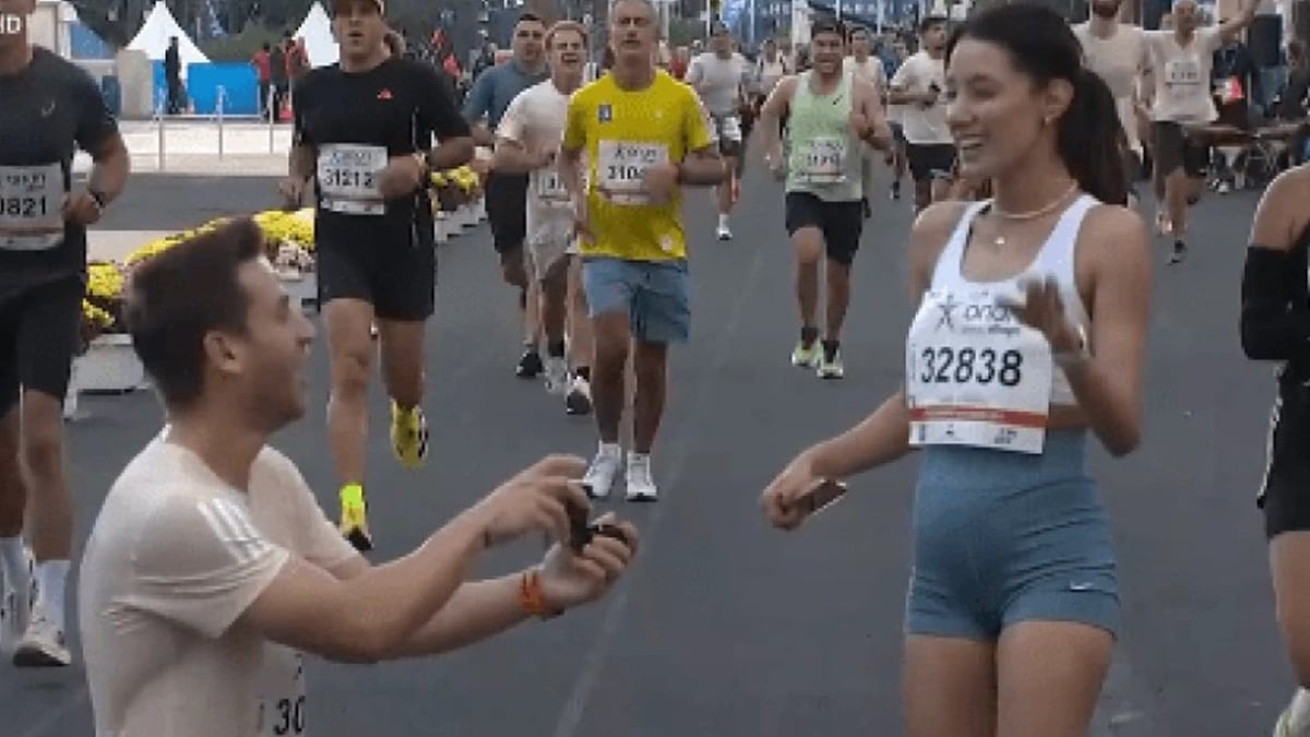 Η νεαρή είπε το «ναι», φόρεσε το μονόπετρο και χάρισε μια τρυφερή αγκαλιά στον αγαπημένο της, χαρίζοντας ένα μοναδικό στιγμιότυπο στους θεατές και στους συμμετέχοντες του Μαραθωνίου.