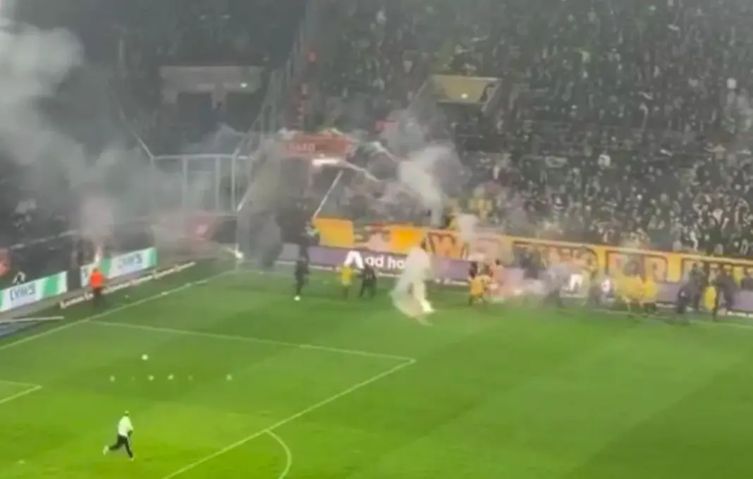 Ο αγώνας, τελικά, διακόπηκε προσωρινά, με την αστυνομία να απομακρύνει τους οπαδούς της Ντιναμό Δρέσδης που κινήθηκαν προς την εξέδρα των φιλοξενούμενων, χωρίς πάντως να έχει ανακοινωθεί ακόμη αν υπάρχουν προσαγωγές ή συλλήψεις.