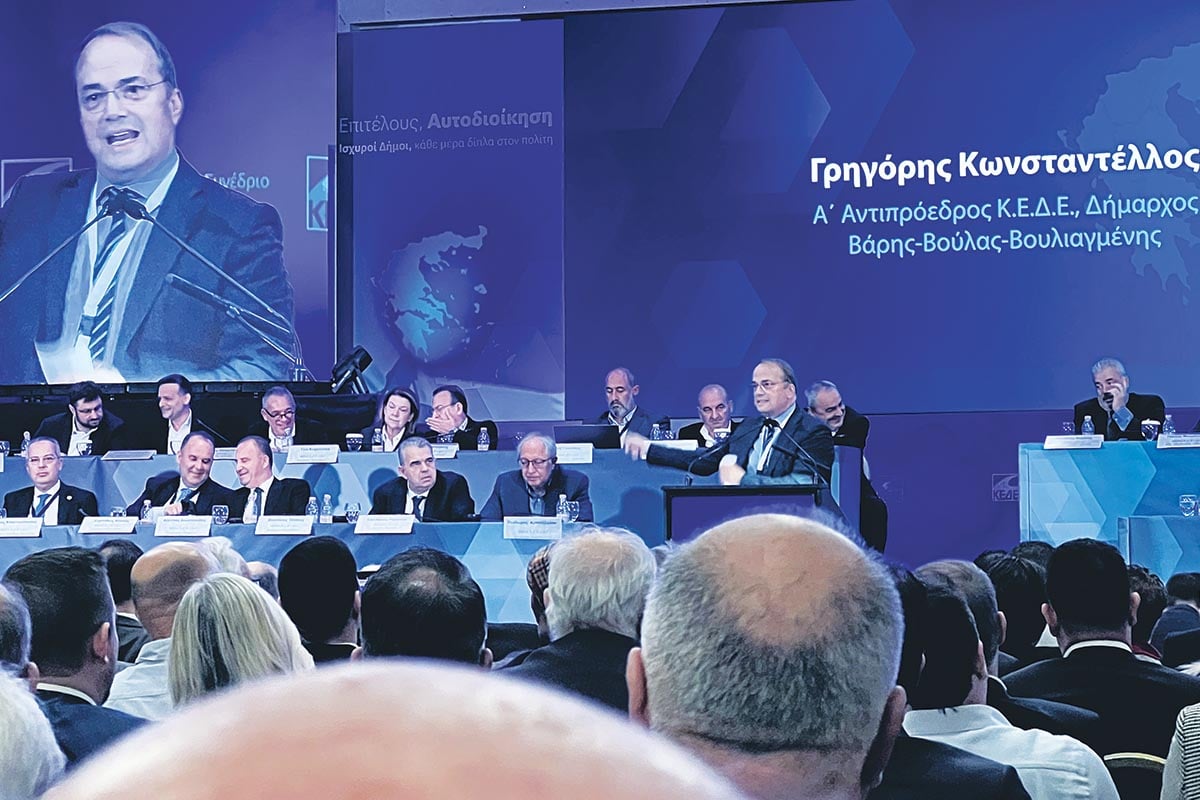 Γροθιά στη μονοτονία και στα… τετριμμένα, που ακούγονται σε κάθε ετήσιο συνέδριο των δημάρχων της χώρας, ήταν η ομιλία του Α’ αντιπροέδρου της ΚΕΔΕ και δημάρχου Βάρης – Βούλας – Βουλιαγμένης, Γρηγόρη Κωνσταντέλλου. Η ομιλία του ηλέκτρισε την ατμόσφαιρα μέσα στην κατάμεστη αίθουσα, καθώς με ύφος αιχμηρό και καυστικό έβαλε ακόμη μία φορά στο στόχαστρο την κυβερνητική στάση απέναντι στην Αυτοδιοίκηση. Οι τοποθετήσεις και οι ατάκες του έγιναν το βασικό θέμα συζήτησης απ’ όλους όσοι παρακολούθησαν το συνέδριο, ακόμη και από τον πρόεδρο του ΣΥΡΙΖΑ Σωκράτη Φάμελλο, ο οποίος μάλιστα τον χειροκρότησε θερμά.