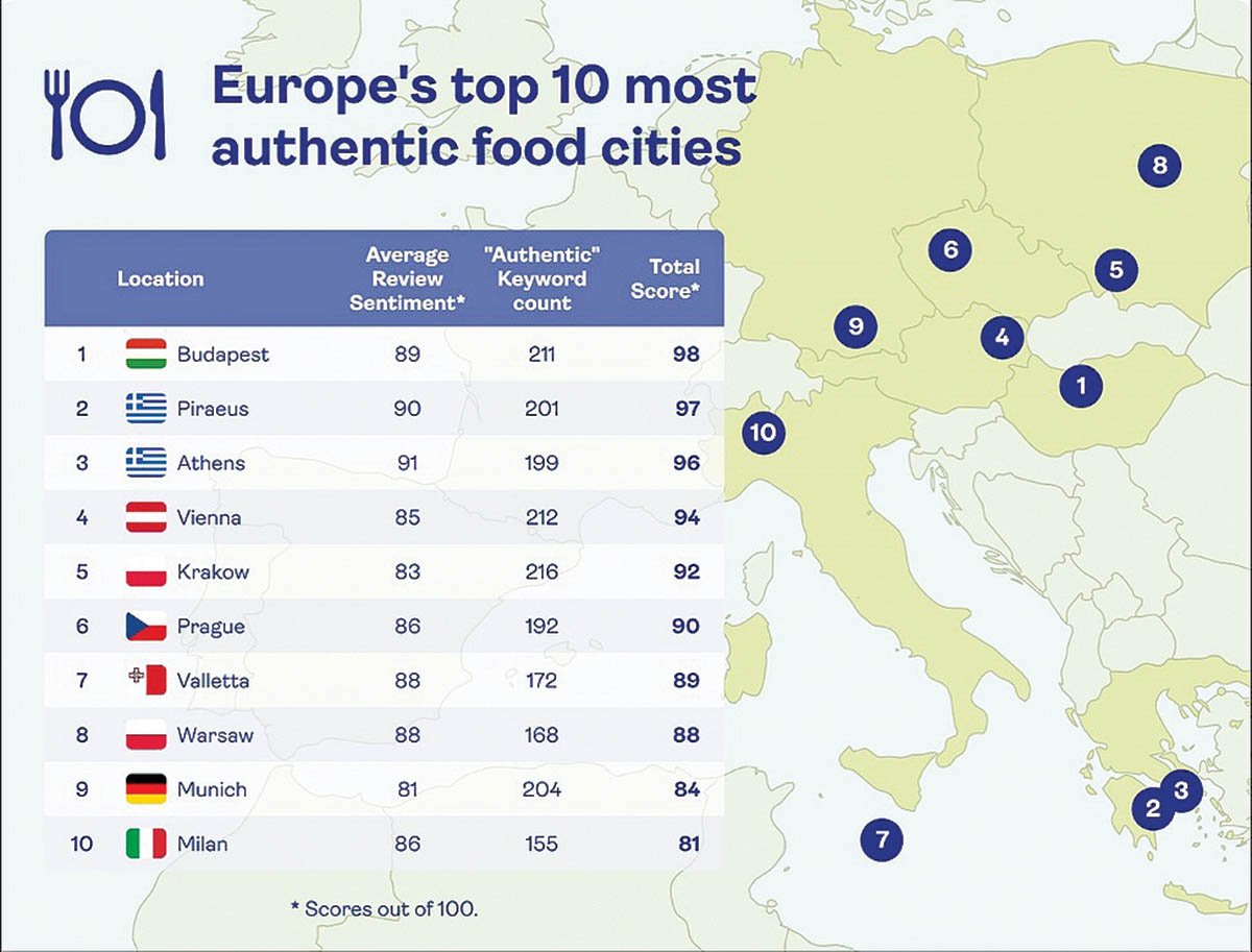 Τη δεύτερη θέση ανάμεσα στις πιο αυθεντικές γαστρονομικές πόλεις της Ευρώπης κατέκτησε ο Πειραιάς, σύμφωνα με πρόσφατη έρευνα της Saga Holidays, σε δείγμα περισσότερων από 5.000 εστιατορίων σε 125 πόλεις. Η αξιολόγηση βασίστηκε σε κριτικές της Google και στους όρους «authentic» και «traditional», με τον Πειραιά να συγκεντρώνει την εντυπωσιακή βαθμολογία 97/100. Πρώτη κατατάχθηκε η Βουδαπέστη, ενώ η Αθήνα συμπλήρωσε την τριάδα.