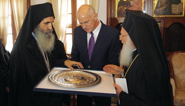 Συνοδευόμενος από πολυπληθές κυβερνητικό κλιμάκιο, ο κ. Παπανδρέου παρέστη στην πατριαρχική θεία λειτουργία, η οποία τελέστηκε στον ιερό ναό του Πρωτάτου, στο Αγιον Ορος, όπου μετέβη χθες για τις εκδηλώσεις εορτασμού 20 ετών από την ανάληψη των πατριαρχικών καθηκόντων του Οικουμενικού Πατριάρχη. Από εκεί, ο κ. Βαρθολομαίος αναφέρθηκε στην ανάγκη σύμπνοιας και ομοψυχίας στον ελληνικό λαό για το ξεπέρασμα της οικονομικής κρίσης, τονίζοντας πάντως ότι απαιτείται «συστράτευση και σύμπνοια πάντων, θυσίας, κόπους και υπομονήν». Ζήτησε δε με νόημα από τον πρωθυπουργό να περιβάλει με «στοργικό ενδιαφέρον και έμπρακτη αγάπη» το Αγιον Ορος και να προσεγγίζει τα εκάστοτε προβλήματά του «άνευ γραφειοκρατικών καθυστερήσεων».