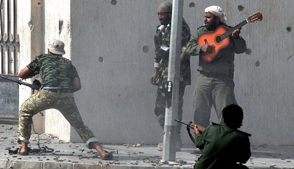 Στο μέτωπο του πολέμου πάντως, και ειδικότερα στη Σύρτη, εκτός από τις νότες του ατρόμητου κιθαρίστα, βροχή συνεχίζουν να πέφτουν και οι σφαίρες. Αν και οι δυνάμεις των αντικαθεστωτικών πολιορκούν την πόλη από τα μέσα Σεπτεμβρίου, οι θύλακες αντίστασης που συναντούν από την πλευρά των πιστών οπαδών του Καντάφι δυσχεραίνουν το έργο τους αναφορικά με την κατάληψη της Σύρτης.