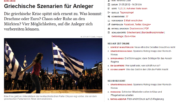 Σύμφωνα με τον αρθρογράφο της «Die Zeit», «πριν ακόμη μπορέσει η Ελλάδα να εγκαταλείψει την ευρωζώνη, τα ευρώ εγκαταλείπουν την Ελλάδα». Επίσης, σχολίαζε ότι μια ενδεχόμενη έξοδος της χώρας μας από το ενιαίο νόμισμα «θα δίχαζε βίαια τη Ελλάδα.