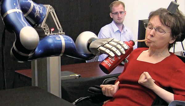 Ερευνητές του Γερμανικού Κέντρου Αεροπορικών και Διαστημικών Ερευνών (DLR) παρουσίασαν έναν ρομποτικό βραχίονα από συνθετικό υλικό και μέταλλο, ο οποίος επιτρέπει στον ασθενή να κάνει αρκετές κινήσεις. Η λειτουργικότητά του αποδείχθηκε στην περίπτωση της 59χρονης Κάθι Χάτσινσον, η οποία έχει υποστεί παράλυση στο χέρι εξαιτίας εγκεφαλικού επεισοδίου που υπέστη πριν από 15 χρόνια, αλλά με τη βοήθειά του κατάφερε να σηκώσει ένα δοχείο με καφέ, να το φέρει κοντά στα χείλη της και να πιει μια γουλιά με καλαμάκι. «Το χαμόγελο που ζωγραφίστηκε αμέσως στο πρόσωπό της είναι κάτι που η ομάδα μου κι εγώ δεν θα ξεχάσουμε ποτέ» είπε ο επικεφαλής της έρευνας, δρ Λάι Χοχμπεργκ, μηχανικός και νευρολόγος στα πανεπιστήμια Μπράουν και Χάρβαρντ.