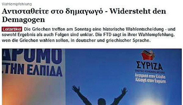 Εξίσου απαράδεκτα και προκλητικά ήταν και τα ρεπορτάζ που δημοσιεύτηκαν για να περιγράψουν την κατάσταση στη χώρα μας. Οι «Financial Times Deutschland», σε μια άνευ προηγουμένου προσπάθεια χειραγώγησης της ελληνικής κοινής γνώμης, δημοσίευσαν άρθρο-σύσταση προς τους Ελληνες ψηφοφόρους, με τίτλο μάλιστα γραμμένο και στα ελληνικά και τα γερμανικά, και τους καλούσαν «να αντισταθούν στον δημαγωγό», δηλαδή να μην ψηφίσουν Αλέξη Τσίπρα, να φροντίσουν «για ξεκάθαρες πολιτικές λύσεις» και να επιλέξουν «κόμματα που αποδέχονται τους όρους των διεθνών χρηματοδοτών». Να σημειώσουμε ότι αντίστοιχες παρεμβάσεις οι «FTD» έχουν κάνει μόνο σε περιπτώσεις εκλογών για το Ομοσπονδιακό Κοινοβούλιο της Γερμανίας. Ο Αντώνης Σαμαράς, μιλώντας την περασμένη Παρασκευή στο Σύνταγμα, είχε μάλιστα αναφερθεί με σκληρά λόγια στο άρθρο λέγοντας ότι «πρόκειται για στημένο δημοσίευμα κάποιων που θέλουν την Ελλάδα έξω από το ευρώ». Εξίσου απαράδεκτη και προκλητική ήταν και η επιστολή προς τους Ελληνες που δημοσίευσε η γερμανική εφημερίδα «Bild».