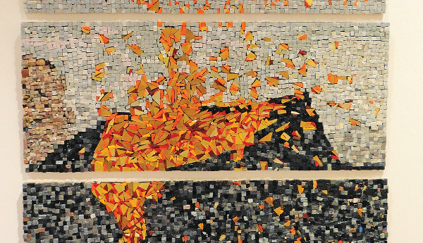 Μάλιστα, δύο από τις φωτογραφίες της καλής της φίλης την ενέπνευσαν ώστε να δημιουργήσει δύο αντίστοιχα ψηφιδωτά. «Επρόκειτο για λήψεις οι οποίες με επηρέασαν αρκετά και δεν ήταν άλλες από το ηφαίστειο στη Γουατεμάλα, αλλά και μια αγορά στο Περού» συνέχισε η ίδια, τονίζοντας ότι τα υλικά με τα οποία δουλεύει είναι το σμάλτο, το μάρμαρο, το βότσαλο, το γυαλί, αλλά και οι κεραμικές ψηφίδες. «Τα υλικά είναι ατελείωτα στο ψηφιδωτό, η λίστα δεν τελειώνει».