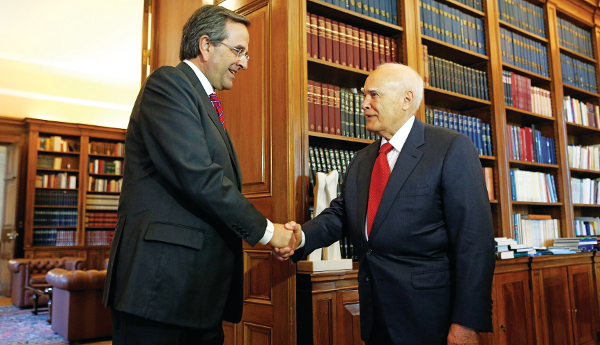 Τέλος, ο πρωθυπουργός που, πριν από τη συνάντηση θα περάσει την Πέμπτη και το εσωκομματικό crash test στην Πολιτική Επιτροπή με την εκλογή γραμματέα (στην οποία το Μαξίμου στηρίζει τον Μανώλη Κεφαλογιάννη) εξερχόμενος χθες από το Προεδρικό Μέγαρο τόνισε μεταξύ άλλων ότι «δίνουμε μια μάχη για να απομακρυνθεί ο κίνδυνος εξόδου της χώρας από το ευρώ. Δίνουμε μια μάχη για να ενισχύσουμε τη διαπραγματευτική θέση της χώρας. Και δίνουμε μια μάχη για να φέρουμε πιο κοντά αυτό που και οι τρεις πολιτικοί αρχηγοί αυτής της κυβέρνησης της εθνικής ευθύνης έχουμε αποφασίσει να κάνουμε και έχουμε υποσχεθεί ότι θα κάνουμε. Δηλαδή να φέρουμε πιο κοντά την ανάκαμψη, περισσότερες θέσεις εργασίας, ιδιαίτερα για τα νέα παιδιά. Να έρθει επιτέλους η ώρα της ανάπτυξης για τον τόπο. Το λόμπι της δραχμής έχασε έναν γύρο αποφασιστικό. Εμείς, όμως, έχουμε πολλή δουλειά μπροστά μας, τις τελευταίες αλλά πολύ δύσκολες αποφάσεις».