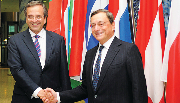 Η Ελλάδα διεκδικεί επιμήκυνση του χρόνου πληρωμής τμήματος του χρέους που οφείλει στην ΕΚΤ αλλά και σε άλλες κεντρικές ευρωπαϊκές τράπεζες. Το θέμα έθεσε χθες στη συννεφιασμένη Φρανκφούρτη ο πρωθυπουργός Αντώνης Σαμαράς, στον διοικητή της Ευρωπαϊκής Κεντρικής Τράπεζας (ΕΚΤ) Μάριο Ντράγκι, ο οποίος επιφυλάχθηκε να του απαντήσει αργότερα.