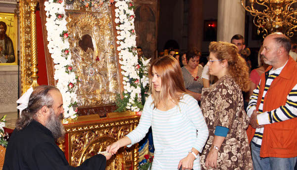 Υπάρχουν στιγμές που η ουρά που σχηματίζουν οι πιστοί στον Αγιο Δημήτριο φτάνει από την είσοδο του ναού μέχρι το ιερό. Ολοι είναι εκεί. Ηλικιωμένοι, άντρες και γυναίκες, έγκυες, μητέρες με τα παιδιά τους, γιαγιάδες και παππούδες με τα εγγόνια τους. Παρά τον κόσμο, στον ιερό ναό επικρατεί σιγή. Οταν φτάνουν στην εικόνα, σκύβουν με ευλάβεια και προσκυνούν. Στα μάτια τους η συγκίνηση είναι έκδηλη. Με δέος κοιτούν τη μητέρα του Χριστού, κάνουν τον σταυρό τους και προσεύχονται. Φιλούν το χέρι του Αγιορείτη μοναχού που στέκεται πιστός φρουρός δίπλα στην εικόνα και παίρνουν ένα μικρό χάρτινο αντίγραφο. Οι πιστοί μπορούν να προσέρχονται στο προσκύνημα από τις 6 το πρωί μέχρι τη 1 το βράδυ, έως και την 31η Οκτωβρίου.