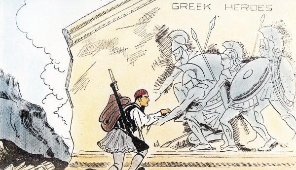 Την επική διάσταση της αντίστασης και της αντεπίθεσης των Ελλήνων θα δώσει το πασίγνωστο περιοδικό «Punch», παραλληλίζοντας τους αρχαίους με τους νέους Ελληνες, ενώ τη θέληση και την αποφασιστικότητα των Ελλήνων θα αποδώσει παραστατικότατα ο Βρετανός χαράκτης και ζωγράφος Clive Uptton (1911-2006).