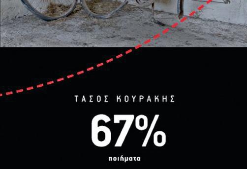Με αυτούς τους στίχους και με ένα ποίημα χωρίς τίτλο τελειώνει η πέμπτη ποιητική συλλογή του βουλευτή Τάσου Κουράκη, με τον τίτλο «67%». Είχαν προηγηθεί άλλες τέσσερις ποιητικές προσπάθειες του βουλευτή του ΣΥΡΙΖΑ, ο οποίος, πέρα από τις ακτιβιστικές του ενέργειες στη Γάζα αλλά και αλλού, έχει μάθει να εντυπωσιάζει και με τις επιδόσεις τους στο χαρτί. Το «Ιχνηλατώντας το παρόν», που ήταν η πρώτη του ποιητική συλλογή, χρονολογείται από το 1995, «Η λίμνη Βικτορία» από το 1997, το «Λέξεις λάμνουν αεί θάλλουν» από το 2002 και το «Ιερωτικόν», που δημιούργησε πολλές συζητήσεις, είχε εκδοθεί πριν από τρία χρόνια. Σε αυτό το τελευταίο διαβάσαμε πολλούς στίχους ερωτικής ποίησης.