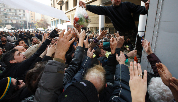 Γυναίκες με παιδιά στην αγκαλιά, ηλικιωμένοι με μαγκούρες, νεαρά ζευγάρια και νοικοκυρές ντυμένες πρόχειρα βρίσκονται εκεί, όχι για να διαμαρτυρηθούν για κάποια από τα εξοντωτικά μέτρα της κυβέρνησης, αλλά για μερικά δωρεάν λαχανικά και φρούτα που διανέμουν οι διαμαρτυρόμενοι παραγωγοί αγροτικών προϊόντων και πωλητές λαϊκών αγορών. Οι μάχες για μια χούφτα χόρτα, δύο πράσα, λίγες ντομάτες και μια μισοάδεια σακούλα πορτοκάλια είναι πραγματικά μέχρι τελικής πτώσης. Οι πάγκοι έχουν προ πολλού αδειάσει και οι σαστισμένοι παραγωγοί, οι οποίοι βρέθηκαν εκεί από τα ξημερώματα για τα δικά τους αιτήματα, έχουν πλέον σκαρφαλώσει σε ένα μεγάλο άσπρο φορτηγό και από εκεί δίνουν στα δεκάδες απλωμένα χέρια τα δωρεάν φρούτα και λαχανικά, σε ένδειξη της αγανάκτησής τους. Τα πιο δυνατά από τα απλωμένα αυτά χέρια καταφέρνουν πρώτα να αρπάξουν τις σακούλες με τα τόσο «πολύτιμα» οπωρολαχανικά. Κάποια μάλιστα από αυτά απλώνονται δύο και τρεις φορές, αφήνοντας τα πιο αδύναμα να αιωρούνται άδεια και τα πρόσωπα κάτω από αυτά γεμάτα απόγνωση, αλλά και αποφασιστικότητα, να αρπάξουν την επόμενη σακούλα.