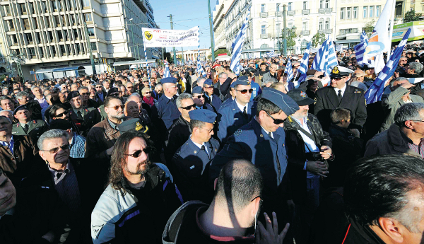 Ειδικότερα, χιλιάδες απόστρατοι και εν ενεργεία, με στολή, στελέχη των Ενόπλων Δυνάμεων και των Σωμάτων Ασφαλείας πραγματοποίησαν το Σάββατο (σαν θηρία στα κλουβί) μεγαλειώδη συγκέντρωση στην πλατεία Κλαυθμώνος και στη συνέχεια πορεία προς τη Βουλή, όπου και παρέδωσαν ψήφισμα στον πρόεδρό της Ευάγγελο Μεϊμαράκη, διαμαρτυρόμενοι για τις περικοπές στις συντάξεις και στις αποδοχές τους, που τους έχουν οδηγήσει σε οικονομικό αδιέξοδο.