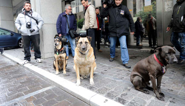 Την επομένη μόνο η «δημοκρατία» σχολίασε το συμβάν με φωτογραφίες στο πρωτοσέλιδό της (στις 4 Μαρτίου). Αμέσως, οι ατρόμητες μουσούδες της αχώριστης σκυλοπαρέας έκαναν τον γύρο του διαδικτύου. Μία εβδομάδα μετά τα… θαρραλέα γαβγίσματα, οι τετράποδοι «αλιτήριοι» όχι μόνο δεν υποδέχτηκαν τους εκπροσώπους των δανειστών μας στη δεύτερη συνάντησή τους με τον υπουργό Οικονομικών Γιάννη Στουρνάρα, αλλά εξαφανίστηκαν γενικώς από τον αγαπημένο τους πεζόδρομο της Ερμού και τα γύρω στενά.