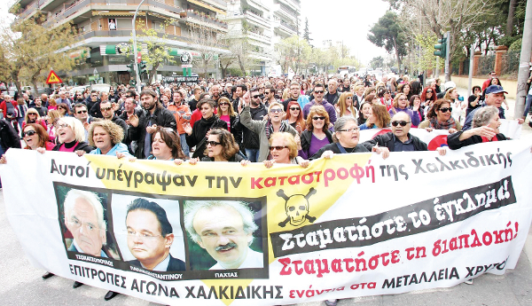 Οι Βόρειοι και οι Νότιοι. Ενας σύγχρονος εμφύλιος. Στη βόρεια πλευρά του κτιρίου της Περιφέρειας Κεντρικής Μακεδονίας οι αντιδρώντες στην επένδυση χρυσού στη Χαλκιδική. Ηλικιωμένοι, νέοι, παιδιά, ακόμα και μωρά στον αγώνα. Στη νότια πλευρά οι εργαζόμενοι της Ελληνικός Χρυσός και υποστηρικτές του έργου, με τη σκέψη στις δουλειές τους και πανό του τύπου «Γονείς χωρίς δουλειά πώς θα ζήσουν τα παιδιά;». Ανάμεσά τους τα ΜΑΤ, οι κλούβες και ένα αγεφύρωτο χάσμα. Χθες το περιφερειακό συμβούλιο της Περιφέρειας Κεντρικής Μακεδονίας στη Θεσσαλονίκη συνεδρίασε με μόνο ένα θέμα: την επένδυση χρυσού στον Δήμο Αριστοτέλη. Από νωρίς άρχισαν να αναπτύσσονται ισχυρές αστυνομικές δυνάμεις εκατέρωθεν του κτιρίου της Περιφέρειας, ώστε να δημιουργηθεί η απαιτούμενη νεκρή ζώνη ανάμεσα στις δύο πλευρές, που συνέρρεαν μαζικά από τη Χαλκιδική.