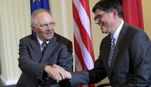 Ο Σόιμπλε εμφανίστηκε άκρως εκνευρισμένος, λέγοντας ότι «μέχρι τώρα δεν έχω ακούσει κάποια συγκεκριμένη πρόταση» και χαρακτήρισε τη δημιουργία νέων χρεών με στόχο την ανάπτυξη που επιχειρούν οι Αμερικανοί «συνταγή από το χρονοντούλαπο». Ο Τζακ Λιου είχε χαρίσει στον Γερμανό ομόλογό του έναν τόμο με την ιστορία του Αλεξάντερ Χάμιλτον, του πρώτου υπουργού Οικονομικών των ΗΠΑ, που είχε σώσει τη χώρα από οικονομική καταστροφή.