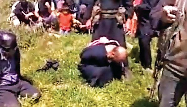 «Βοηθούν τις κυβερνητικές δυνάμεις ενάντια στους μουτζαχεντίν. Ακόμη δεν είχαν απελευθερωθεί και βρήκαμε στην κατοχή τους τηλέφωνα αξιωματούχων. Πού βρήκαν αυτά τα τηλέφωνα των αρχών του Χαλεπίου;» Ο όχλος αλαλάζει: «Αλλάχ Ακμπάρ (ο Θεός είναι μεγάλος) και η δόξα είναι στον Θεό». Ακούγονται φωνές: «Kάντε πίσω, κάντε πίσω». Τότε κάποιοι φωνάζουν: «Δώστε ένα μαχαίρι. Ενα που να κόβει καλά». Με ξίφος αποκόπτονται τα κεφάλια του ρασοφόρου και του πολίτη. Το βίντεο διακόπτεται στον αποκεφαλισμό τρίτου ανθρώπου, που προσεύχεται γονατιστός.