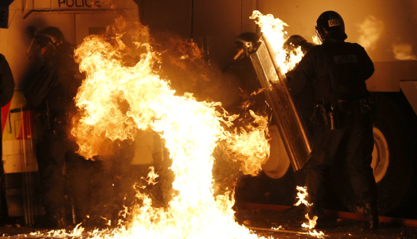 Διαμαρτυρόμενοι λοιπόν για την «απαγορευμένη τους πορεία», φορώντας κουκούλες και κρατώντας ακόμα και σπαθιά, οι προτεστάντες διαδηλωτές πέταξαν μολότοφ, πέτρες, μπουκάλια και άλλα αντικείμενα κατά των αστυνομικών, οι οποίοι απάντησαν με σφαίρες καουτσούκ και αντλίες νερού. Αποτέλεσμα; Τραυματίστηκε ακόμα ένας αστυνόμος.