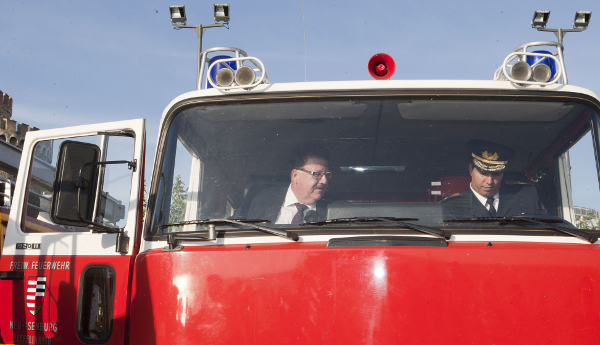 Τα τέσσερα πυροσβεστικά οχήματα παρέδωσε στο Εθελοντικό Σώμα Ελλήνων Πυροσβεστών Αναδασωτών (ΕΣΕΠΑ) παρουσία του αντιπεριφερειάρχη Κεντρικής Μακεδονίας Θεοφάνη Παπά και του εντεταλμένου περιφερειακού συμβούλου και αρμόδιου για θέματα Πολιτικής Προστασίας της Περιφέρειας Κεντρικής Μακεδονίας Βασίλη Τουλίκα. Μάλιστα προανήγγειλε την αποστολή ακόμη τεσσάρων πυροσβεστικών οχημάτων, τα οποία θα ξεκινήσουν το ταξίδι τους από τη Γερμανία στην Ελλάδα την ημέρα έναρξης της 4ης Ελληνογερμανικής Συνέλευσης, που θα πραγματοποιηθεί τον Οκτώβριο στη Νιρεμβέργη.
