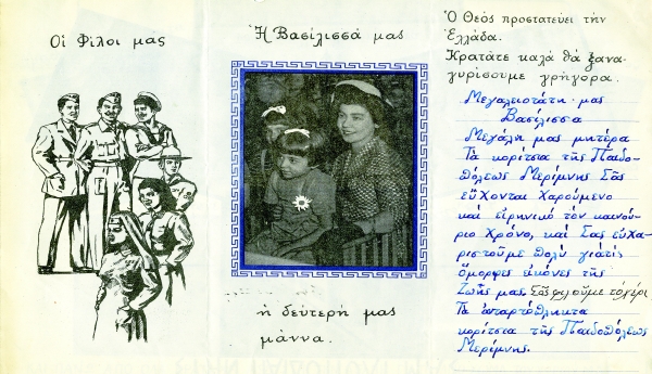 Ιδιου ύφους ήταν και η επιστολή με πρωτοχρονιάτικες ευχές που απέστειλαν προς τη βασίλισσα Φρειδερίκη, «τη δεύτερή τους μάνα», όπως γράφουν χαρακτηριστικά, τα κορίτσια της Παιδοπόλεως Μερίμνης. Οι ευχές είναι γραμμένες σε υπόδειγμα κάρτας της Προνοίας Βορείων Επαρχιών της Ελλάδος.