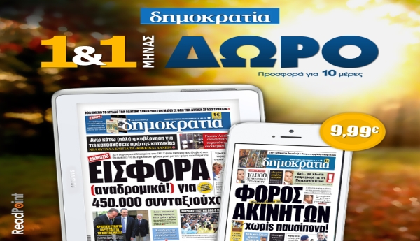 Από σήμερα και για τις επόμενες 10 ημέρες, επιλέγοντας να γίνετε συνδρομητές και να λαμβάνετε ηλεκτρονικά τη «δημοκρατία» για ένα μήνα, η εφημερίδα μας και η ReadPoint σας κάνουν δώρο έναν επιπλέον μήνα συνδρομής, για να έχετε περισσότερη «δημοκρατία» στα χέρια σας! Για περισσότερες πληροφορίες και για να γίνετε συνδρομητές όσο διαρκεί η προσφορά, κάντε κλικ εδώ.