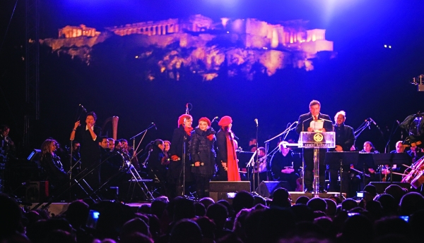 Μόλις ο παλιός ο χρόνος μάς… άφησε νεαρά ζευγάρια αντάλλαξαν τα πρώτα τους φιλιά και όλοι έστρεψαν τα μάτια τους στον ουρανό για να απολαύσουν το υπερθέαμα με τα πυροτεχνήματα, με φόντο τον επιβλητικό Παρθενώνα. Ξεχωριστό χρώμα στην εκδήλωση έδωσαν οι ήχοι των κρουστών της Συμφωνικής Ορχήστρας του Δήμου Αθηναίων και των υπόλοιπων ομάδων κρουστών, ταυτόχρονα με τα κάλαντα από τους συμμετέχοντες καλλιτέχνες. Στη συνέχεια ο Γιώργος Καμίνης κάλεσε τον Νίκο Πορτοκάλογλου, τη Γιώτα Νέγκα και τους σολίστ Μ. Ψύρρα, Λ. Μεσσήνη, Ελένη Πέτα και Βασίλη Λέκκα να τραγουδήσουν τα κάλαντα. Στη σκηνή παρέμεινε ο Νίκος Πορτοκάλογλου και λίγο μετά τη μία τα ξημερώματα ακολούθησαν οι Γιώτα Νέγκα και Γεράσιμος Ανδρεάτος.