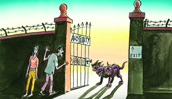 Το δημοσίευμα συνοδεύεται από σκίτσο του Πίτερ Σρανκ, στο οποίο απεικονίζεται ο Κέρβερος μπροστά σε μια πύλη που στην καγκελόπορτα γράφει «Λιτότητα» και στον τοίχο δεξιά «Εξοδος», ενώ δύο άνθρωποι κοιτούν διστακτικά προσπαθώντας πιθανώς να βρουν τον τρόπο διαφυγής. Ο «Economist» αναφέρει ότι η πιο πικρή κριτική κατά της τρόικας γίνεται στην Ελλάδα «και υπάρχει κάποιος λόγος», καθώς η ανεργία έχει εκτιναχθεί στο 27%. Αναφερόμενο στις προστριβές της κυβέρνησης με τους εκπροσώπους των δανειστών, το δημοσίευμα σημειώνει ότι «η περίοδος της διαφωνίας είναι περίεργη, καθώς η Ελλάδα έχει την προεδρία της Ε.Ε. και η αποδυναμωμένη της κυβέρνηση ρισκάρει τον εξευτελισμό στις ευρωεκλογές του Μαΐου από τα κόμματα που είναι εναντίον της τρόικας». Παράλληλα, το περιοδικό σχολιάζει και το ενδεχόμενο να διαλυθεί η τρόικα, καθώς η Ιρλανδία και η Ισπανία έχουν ολοκληρώσει τα προγράμματα διάσωσης και επιστρέφουν στις αγορές, ενώ η Πορτογαλία μπορεί να κάνει το ίδιο την άνοιξη.